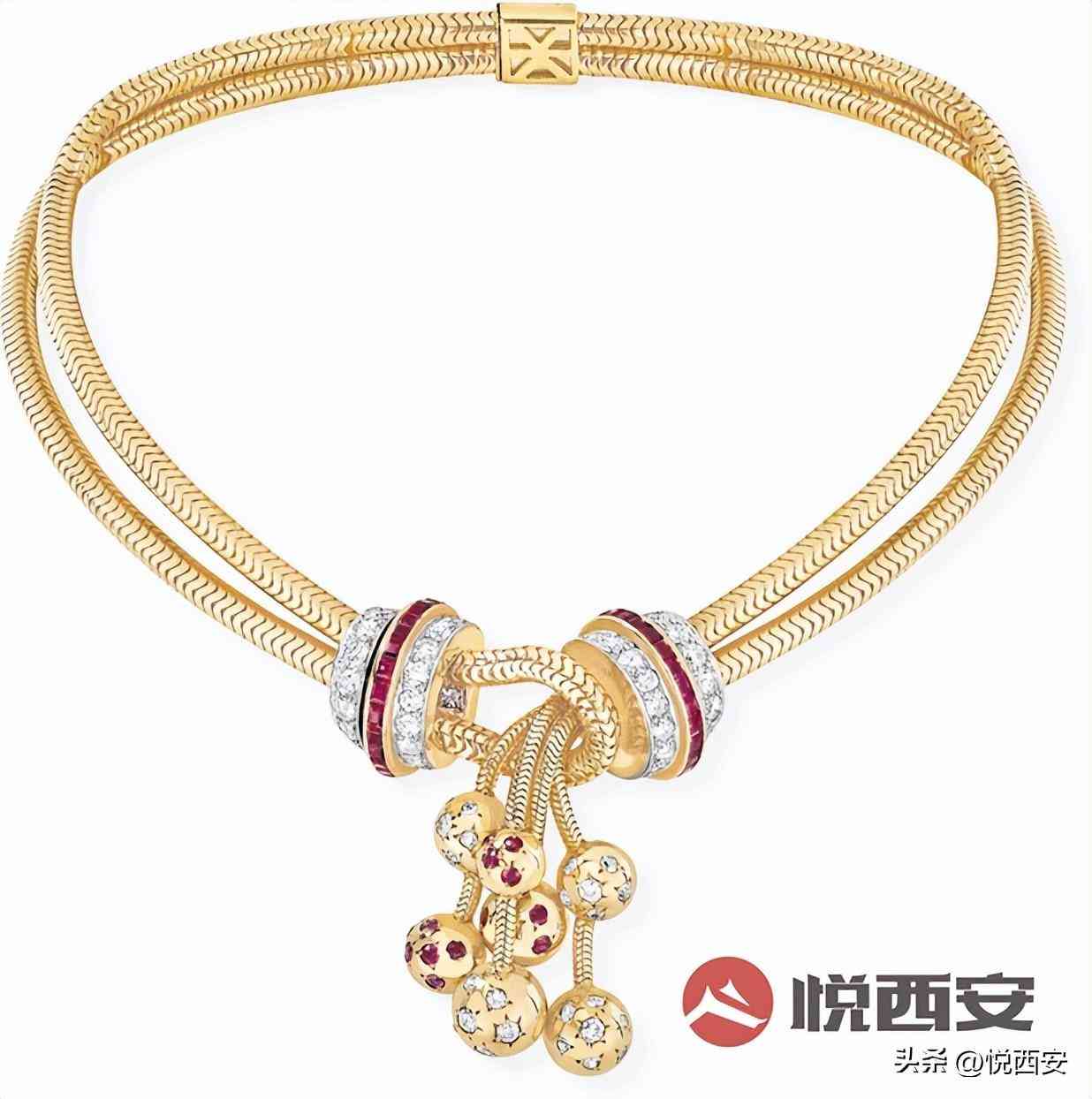 圓潤(rùn)的金珠落在頸間,宛如飾于窗簾上的流蘇。金珠隨律動(dòng)搖曳,款款動(dòng)人,如同譜寫一曲清泠動(dòng)人的樂(lè)章。項(xiàng)鏈其上的鑲嵌成星形的紅寶石和鉆石,熠熠星光,與鑲嵌寶石的鏈扣和兩個(gè)抽象的珠寶圖案交相輝映,為這款項(xiàng)鏈增添珠寶韻律的光彩。