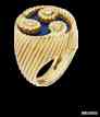 此珠寶套件中每一件珠寶均飾有一個(gè)或數(shù)個(gè)圓形主題圖案,以青金石鑲嵌而成, 黃K金細(xì)節(jié)點(diǎn)綴其中。其設(shè)計(jì)令人聯(lián)想至璀璨流星,頂部為一顆華美的鉆石,末端則由黃K金雕刻而成。如漩渦狀的構(gòu)圖洋溢動(dòng)感,對(duì)比色彩濃郁的材質(zhì)將抽象的設(shè)計(jì)演繹得生動(dòng)傳神:深藍(lán)色的青金石夜空中,黃K金和鉆石如星塵閃耀,寶石內(nèi)的黃鐵礦,宛如星光灑遍浩瀚的銀河。