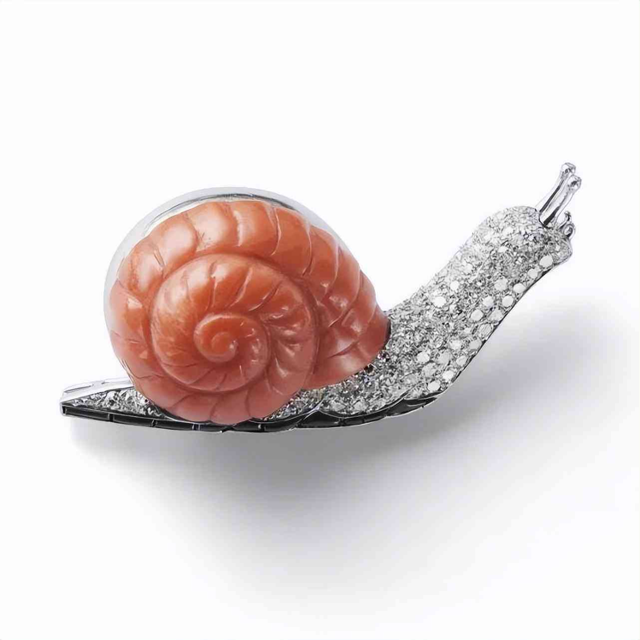 蝸牛造型胸針是 Cartier 的設計品之一,這枚胸針設計于1935年,它的制作材料是珊瑚瑪瑙和鉆石,通過特殊的切割手法,完美地打造出了蝸牛的形態(tài)。橘粉色的珊瑚也更好地呈現(xiàn)了蝸牛的顏色,這個珊瑚的顏色和蝸牛的殼基本一致,所以制作出來的胸針也有著極高的還原度。