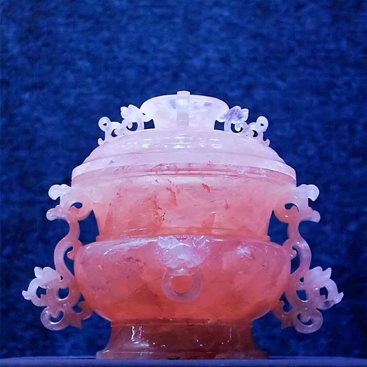 這件芙蓉石蟠螭耳蓋爐現(xiàn)在被南京博物館所收藏,整件物品是用芙蓉石打造的。可能很多人都不是很了解芙蓉石是什么。芙蓉石就是很多人口中的粉水晶,粉水晶也被人們稱為愛情石,很多情侶認為芙蓉石可以為情侶帶來甜蜜,同時還有招桃花的意思,所以也有很多單身的女性會佩戴芙蓉石。