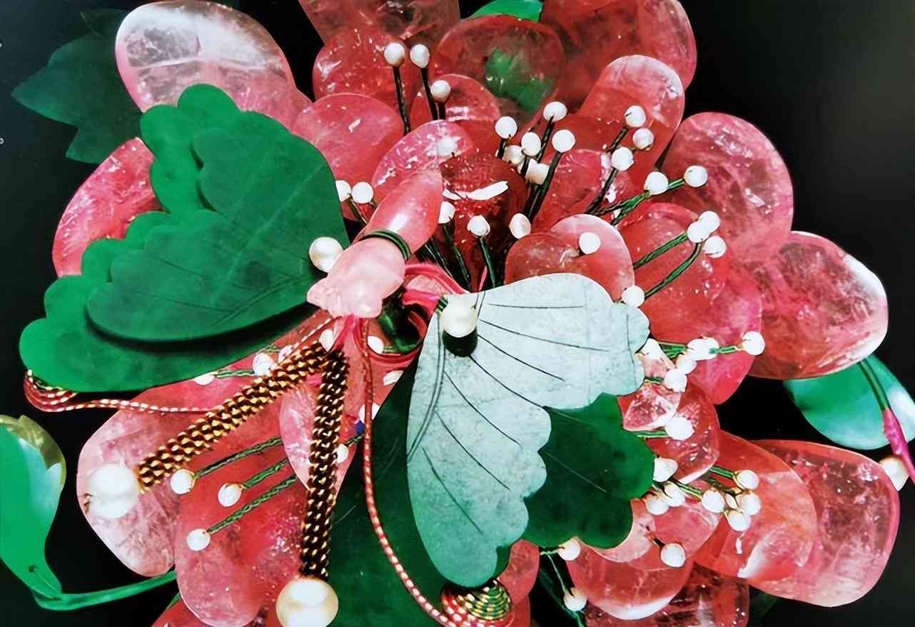 比如這件鑲嵌寶石的發(fā)簪,用粉色的碧璽完美地呈現(xiàn)出了花瓣的形態(tài)花展,上面還有了一只綠色的蝴蝶。蝴蝶的翅膀是用綠色的翡翠制作而成的,米白色的珍珠制作出了蝴蝶的觸角,整體看起來非常的靈動,仿佛將一整朵花濃縮在了發(fā)簪上,將這個發(fā)簪的佩戴在發(fā)間則會顯得整個人更加的靈動,打造出一種又美又仙的感覺。