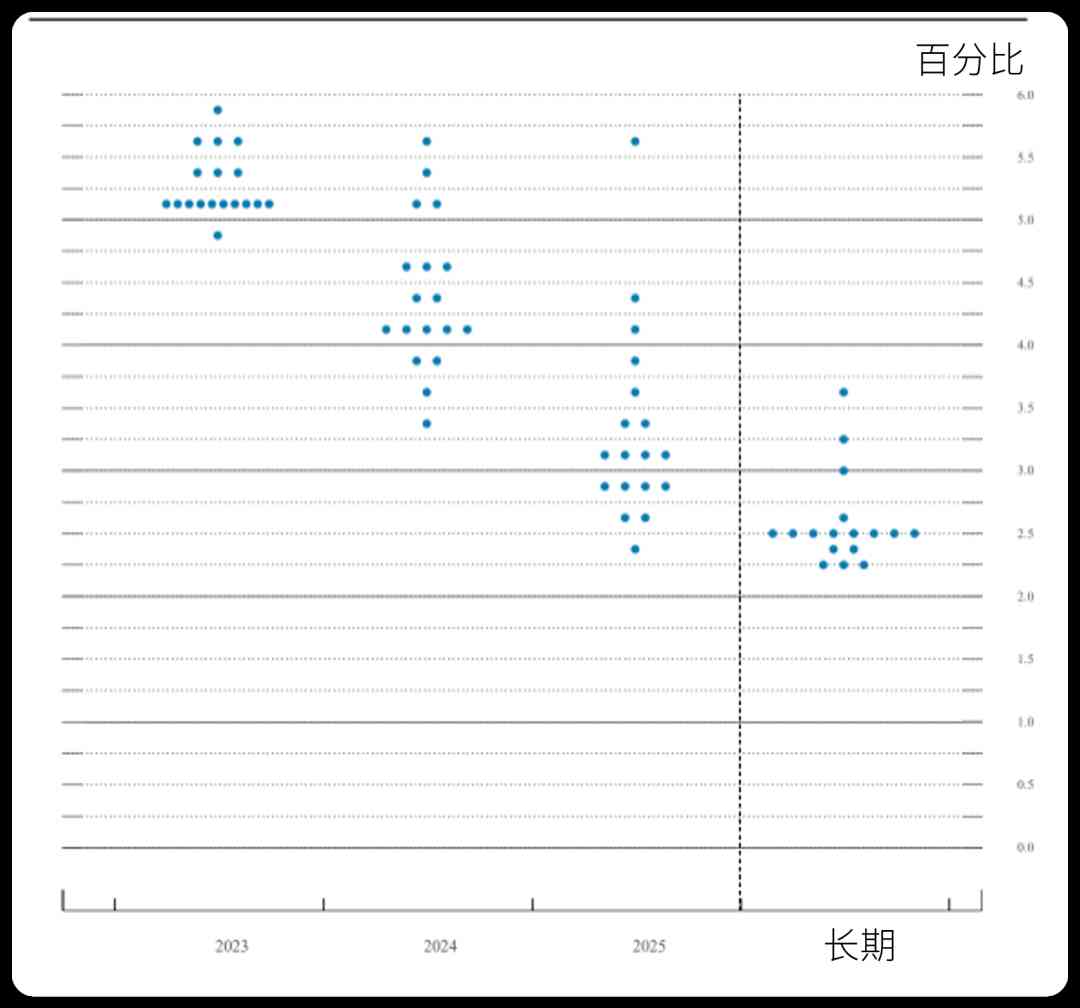 按照的點陣圖,大多數(shù)委員覺得到今年年底,美聯(lián)儲的聯(lián)邦基金目標(biāo)利率最好是落在5%~5.25%之間