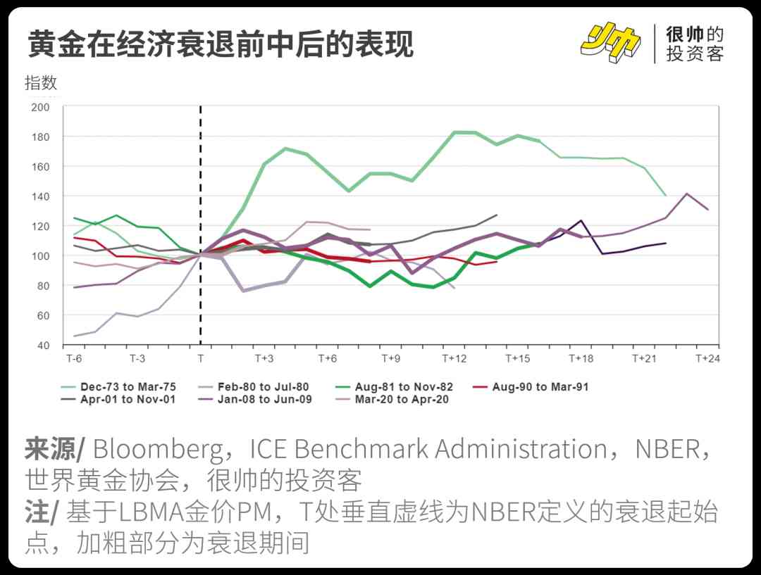 按過往數(shù)據(jù)來看,前幾次經(jīng)濟(jì)衰退,黃金的收益大多都挺好看的——