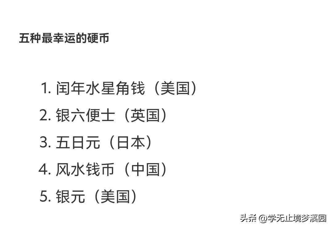 “見(jiàn)一分錢(qián)撿起來(lái),一整天都會(huì)有好運(yùn)。把它放在那里,你會(huì)絕望的?!?我們中的許多人都聽(tīng)說(shuō)過(guò)幸運(yùn)便士。我們中的一些人也曾將硬幣扔進(jìn)噴泉以實(shí)現(xiàn)愿望。有些人認(rèn)為在地上找到一枚正面朝上的硬幣是好運(yùn);如果面朝下,它應(yīng)該留在地上。以下是迄今為止最幸運(yùn)的五枚代幣的列表: