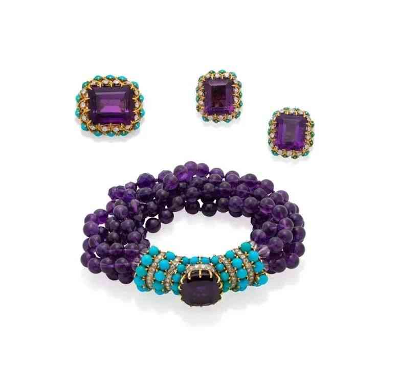 紫水晶、綠松石及鉆石手鏈、耳環(huán)和戒指套裝 (日內瓦拍賣,2020年) 成交價:40,000瑞士法郎