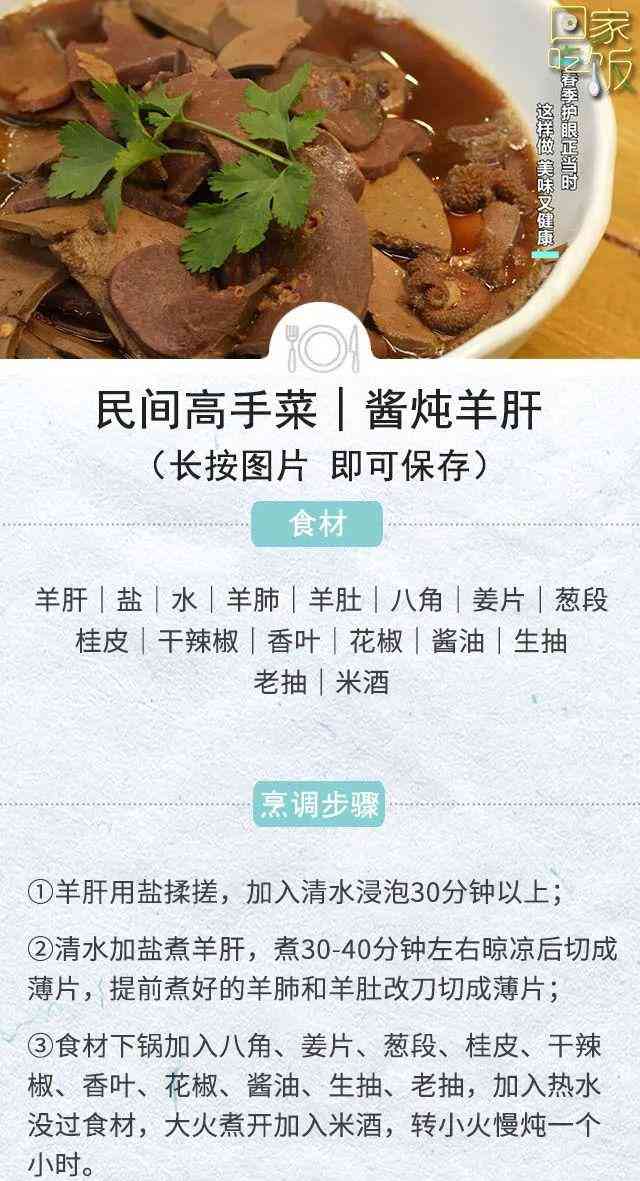 無論是接地氣家常的醬燉羊肝,還是精工細作的翡翠白玉珠,都是利用家里常見的食材制作營養(yǎng)豐富,護眼明目的美食,您學會了嗎?