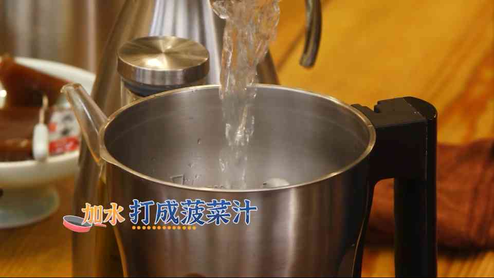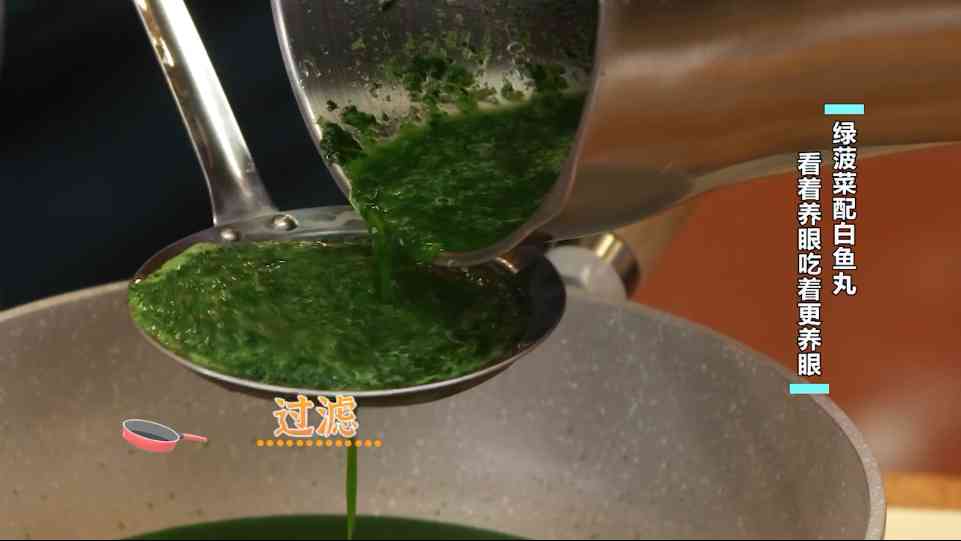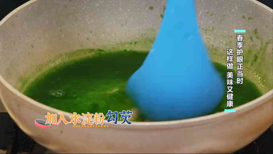 菠菜改刀,放入開水中焯水,撈出后加水打成菠菜汁,過濾倒入鍋中,加入鹽、糖,加入水淀粉勾芡。