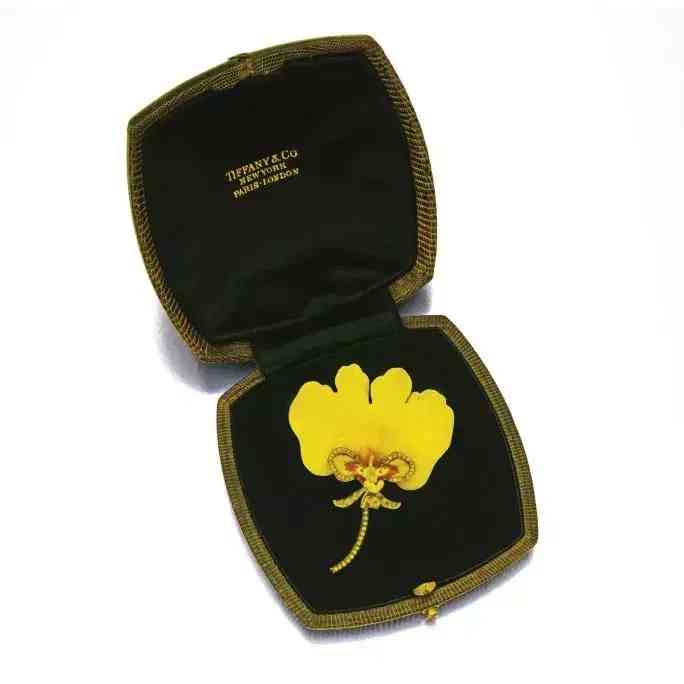 在1988年巴黎世博會上,Tiffany奢華的展品中,一組25件的精致的蘭花主題珠寶吸引了參觀者的目光。這組包括胸花及頭飾的作品以珍稀蘭花品種為造型,表現(xiàn)極為生動,全部采用琺瑯鍍金工藝,顏色鮮艷。