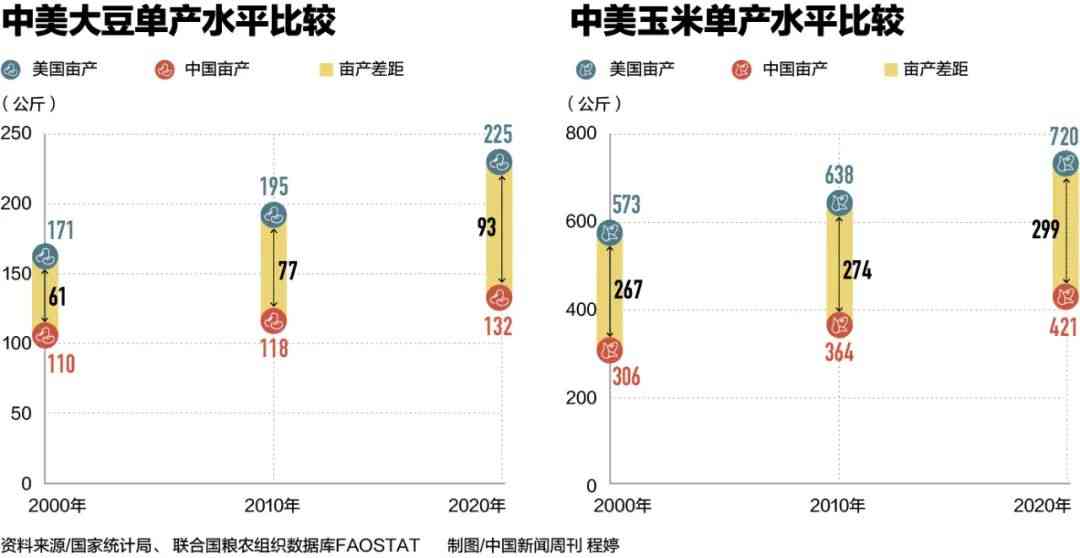 根據(jù)國家統(tǒng)計局以及聯(lián)合國糧農(nóng)組織數(shù)據(jù)庫的數(shù)據(jù),2020年,中國大豆和玉米的畝產(chǎn)水平均已達(dá)到歷史最高,但均不到同年美國兩種作物畝產(chǎn)的60%。