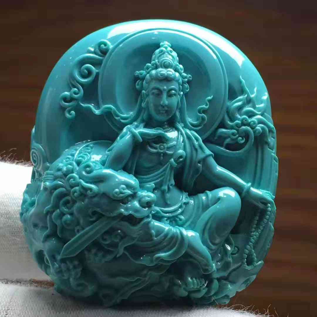 作品簡述:《文殊菩薩》精選玉化料綠松石雕刻,全品無任何瑕疵,器型規(guī)整大氣,尺寸37*43*18mm,重43.8克