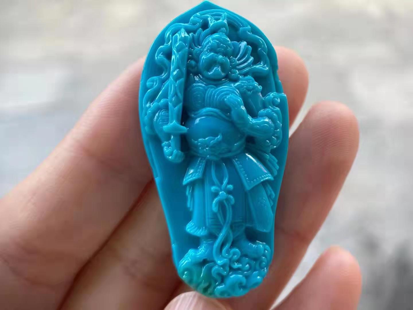 作品簡述:《韋陀菩薩》精選暴力藍(lán)玉化料綠松石雕刻,全品無瑕疵,工料俱佳,尺寸:23×46×11.5mm,重:16.9克!