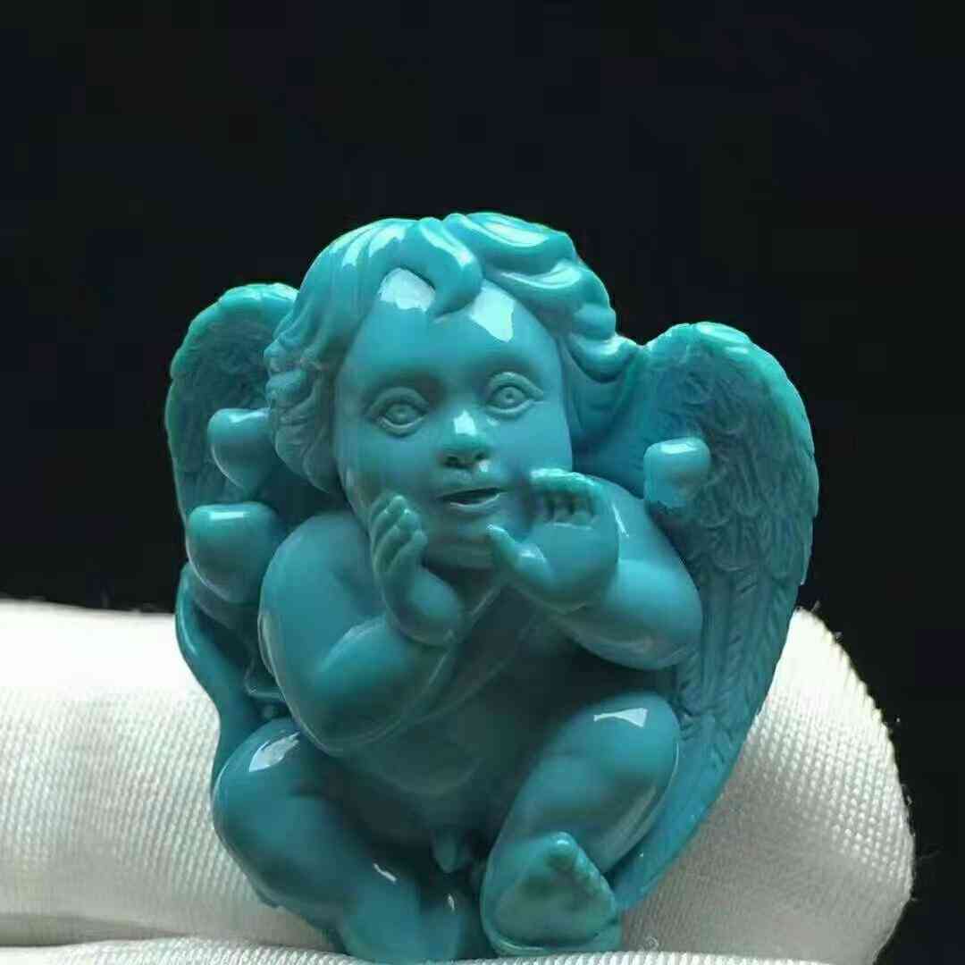 作品簡述:《天使》玉化綠松石雕刻,大師親工作品,尺寸28×32×15.5mm,重14.29克,全品無瑕。