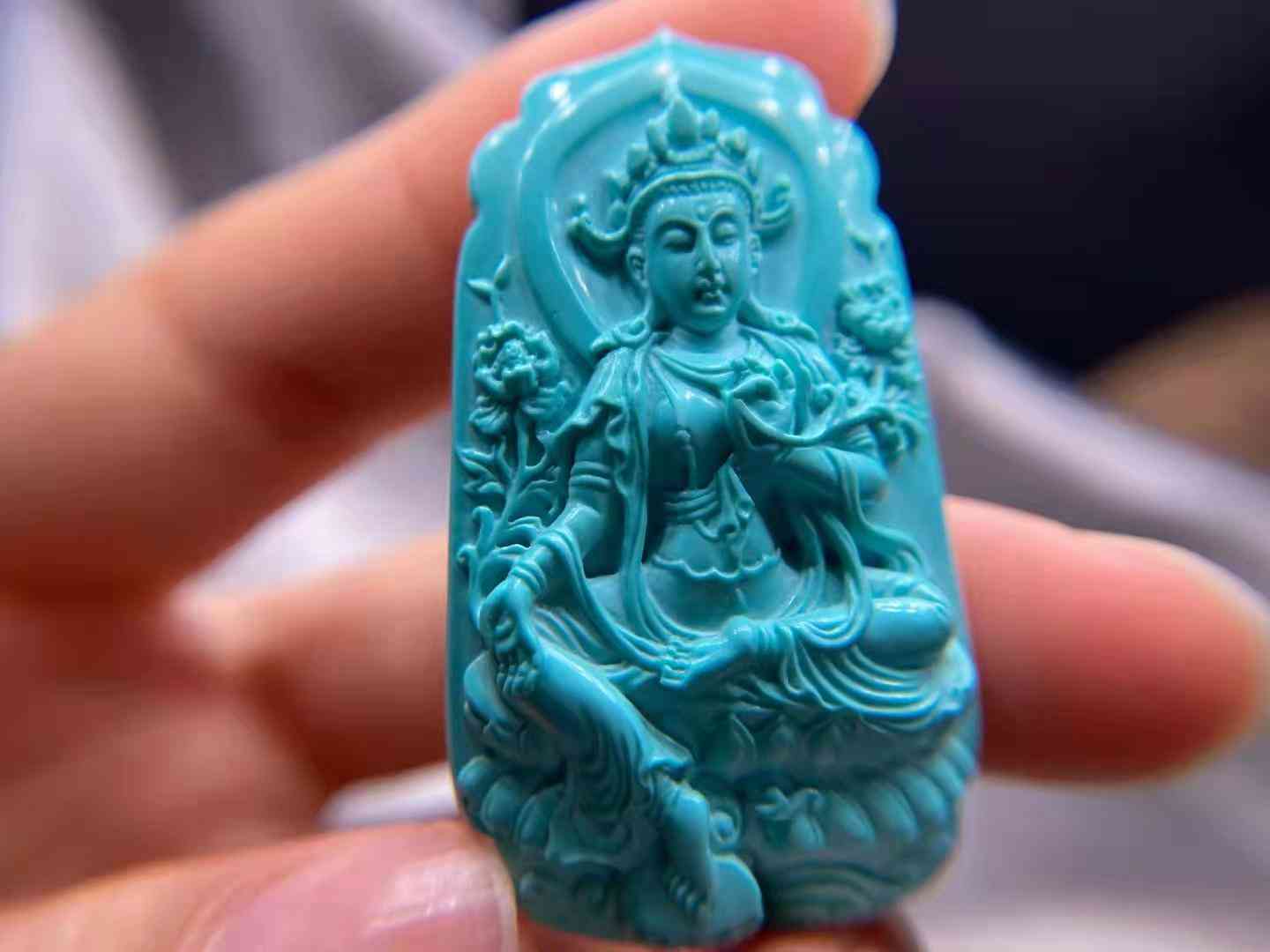 #文玩同好會#作品簡述:《虛空藏菩薩》精選金龍山綠松石雕刻,品相完美,尺寸35.5×49×14mm,重量39克