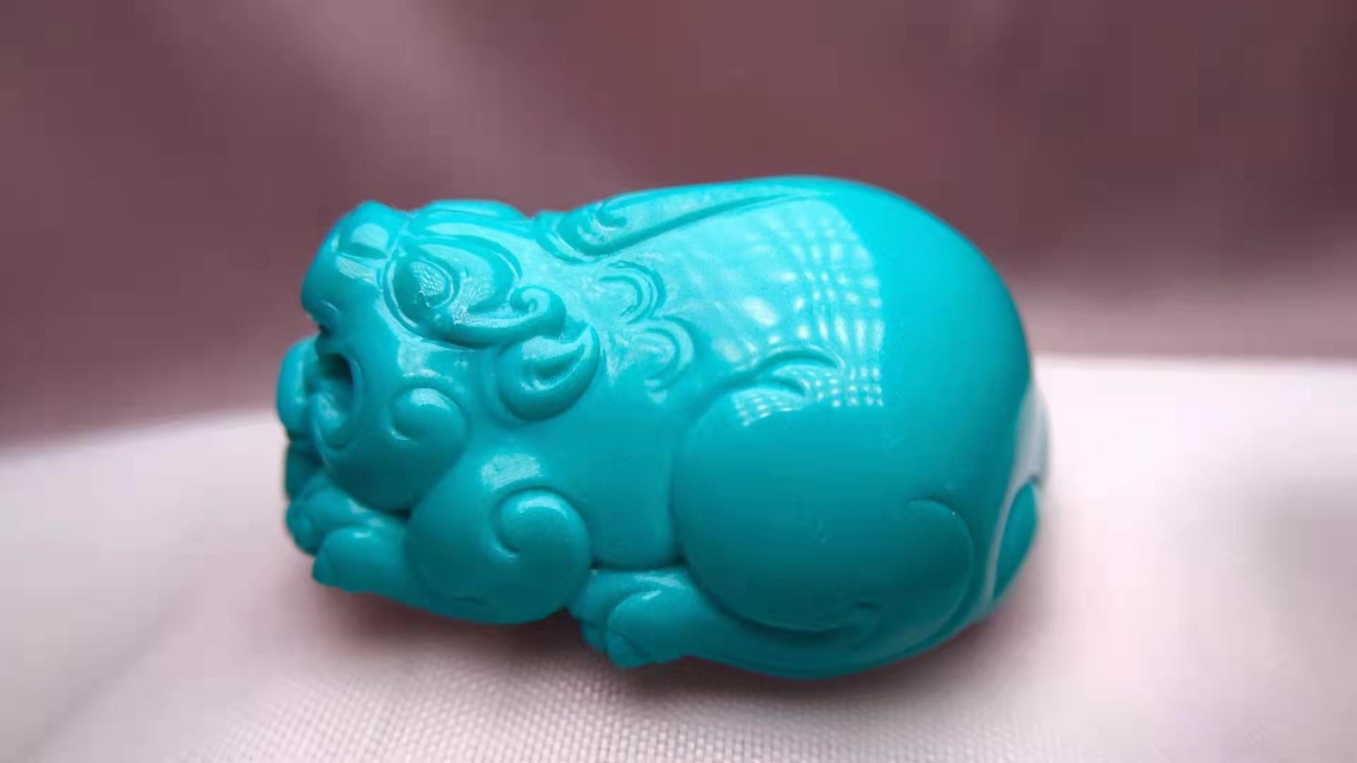 作品簡介:瑞獸《貔貅》精選瓷釉級綠松石雕刻,料質(zhì)全品無瑕疵,刻畫生動威猛,栩栩如生,尺寸30*21*17mm,重13.3克