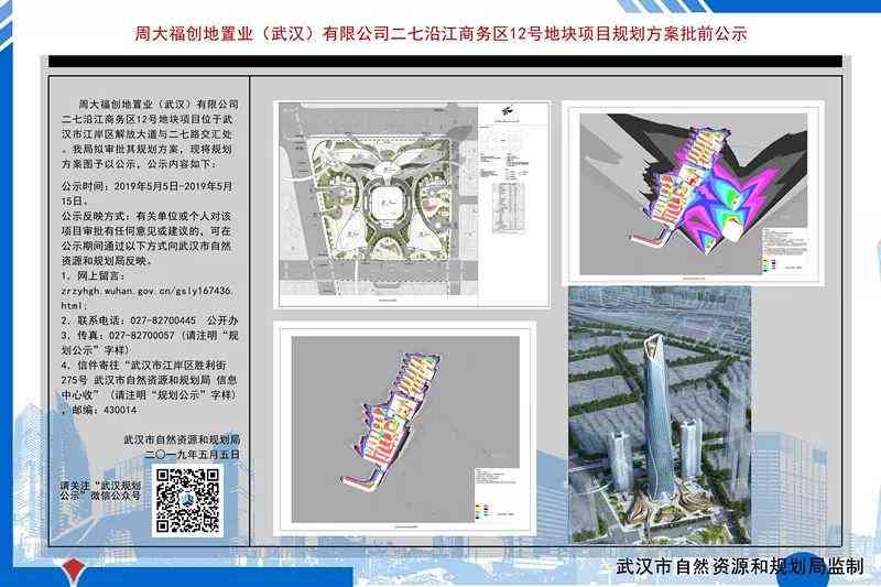 公示信息顯示,周大福創(chuàng)地置業(yè)(武漢)有限公司二七沿江商務(wù)區(qū)12號(hào)地塊項(xiàng)目規(guī)劃方案批前公示。其中,周大福中心規(guī)劃高度擬定為475米,其中主體部分85層,高度為442.65米。