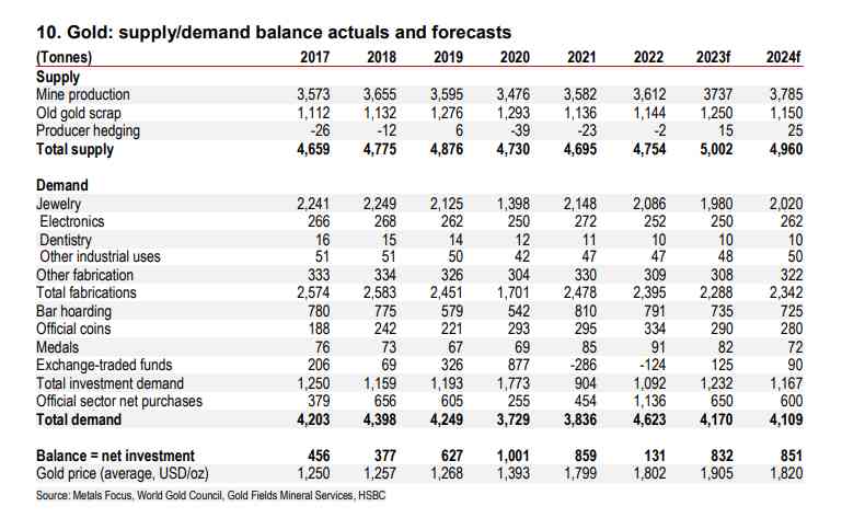 供給端方面,匯豐指出,礦山產(chǎn)量上升,今明兩年供給可能進(jìn)一步上升;黃金回收規(guī)模也可能因價(jià)格上漲而上升,2024年金價(jià)可能會(huì)下降。