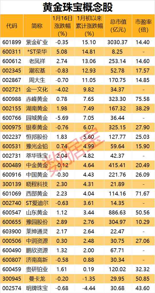 證券時(shí)報(bào)·數(shù)據(jù)寶統(tǒng)計(jì)顯示,A股中布局黃金珠寶的概念股共有27只,1月16日共15股上漲,*ST榮華漲停,豫園股份、老鳳祥、曉程科技等6股漲幅居前,均超過(guò)2%。