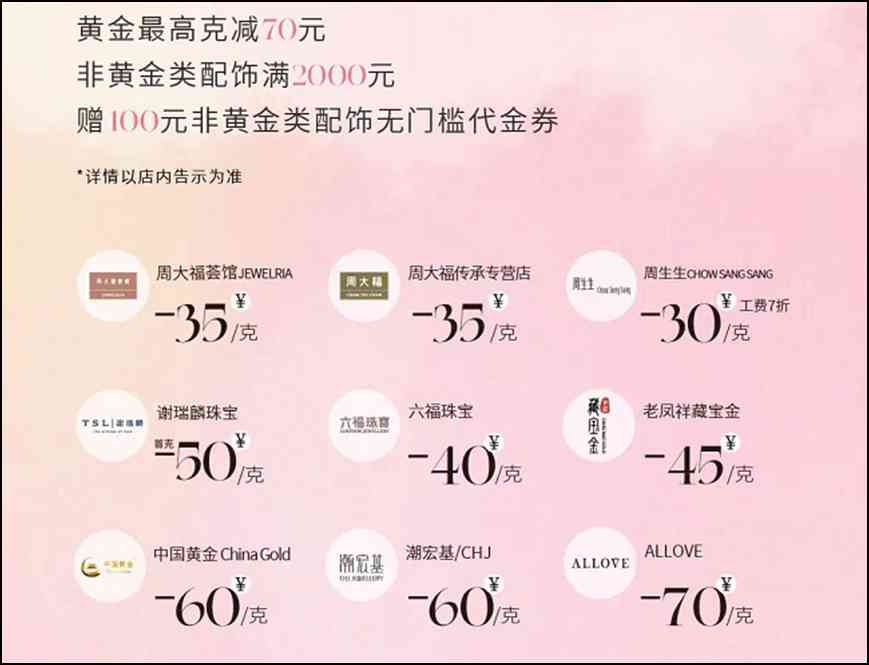 此外,在望海國際廣場的黃金屋也在推出88折扣,且七夕節(jié)當(dāng)天消費(fèi)滿1588元可持小票參與幸運(yùn)大抽獎(jiǎng)活動(dòng)。在??谖釔倧V場的中國黃金、老鳳祥、周大福、周生生等線下門店分別推出68折扣、85折扣、每買滿1000減100的活動(dòng)…