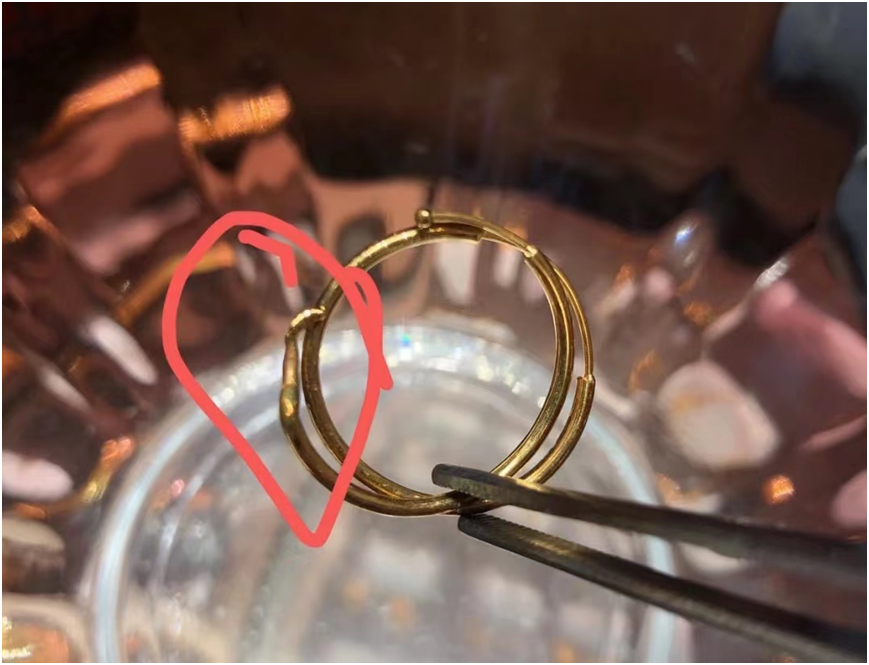 某消費(fèi)者在小紅書平臺上,曬出自己在中國黃金加盟店柜臺購買的一對金耳圈,準(zhǔn)備置換驗(yàn)黃金的時(shí)候才發(fā)現(xiàn)純度不對。據(jù)消費(fèi)者回憶,當(dāng)時(shí)在中國黃金加盟店柜臺購買時(shí),是按件賣,不按克賣,折后價(jià)1593元。過后一個(gè)月,準(zhǔn)備置換其他店鋪的首飾,柜員驗(yàn)完黃金后發(fā)現(xiàn),金耳圈的顏色發(fā)生變化,明顯純度不夠,諷刺的是耳釘上還印著足金999的字樣。