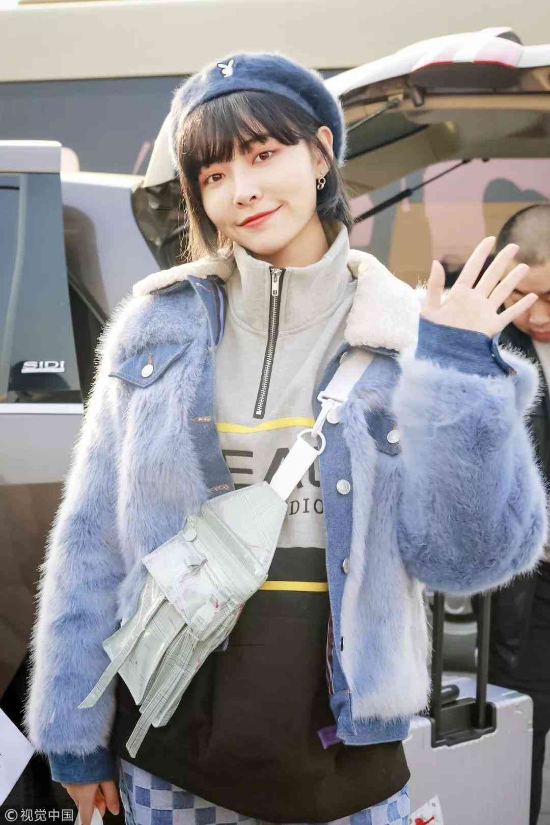 徐佳琪別出心裁地選擇皮草夾克+高領(lǐng)字母半拉鏈運(yùn)動(dòng)衫的搭配,運(yùn)動(dòng)衫的休閑舒適緩解了皮草的厚重感,帶有小兔子刺繡的藍(lán)色毛毛貝雷帽讓整個(gè)人元?dú)飧猩倥袧M滿。