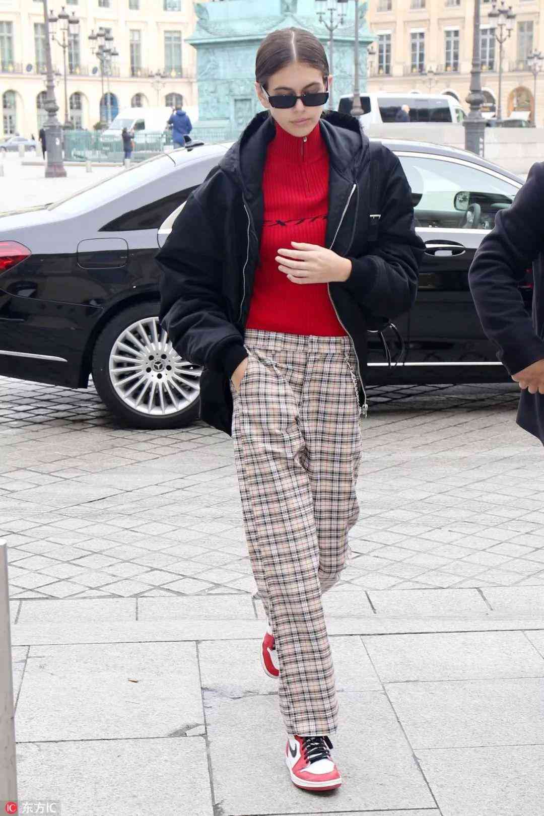 或者像Kaia Gerber走復(fù)古運(yùn)動(dòng)風(fēng),選擇帽衫黑色棒球棉服外套+紅色針織運(yùn)動(dòng)衫內(nèi)搭,格紋褲和Nike讓造型的復(fù)古感又上升一個(gè)臺(tái)階。