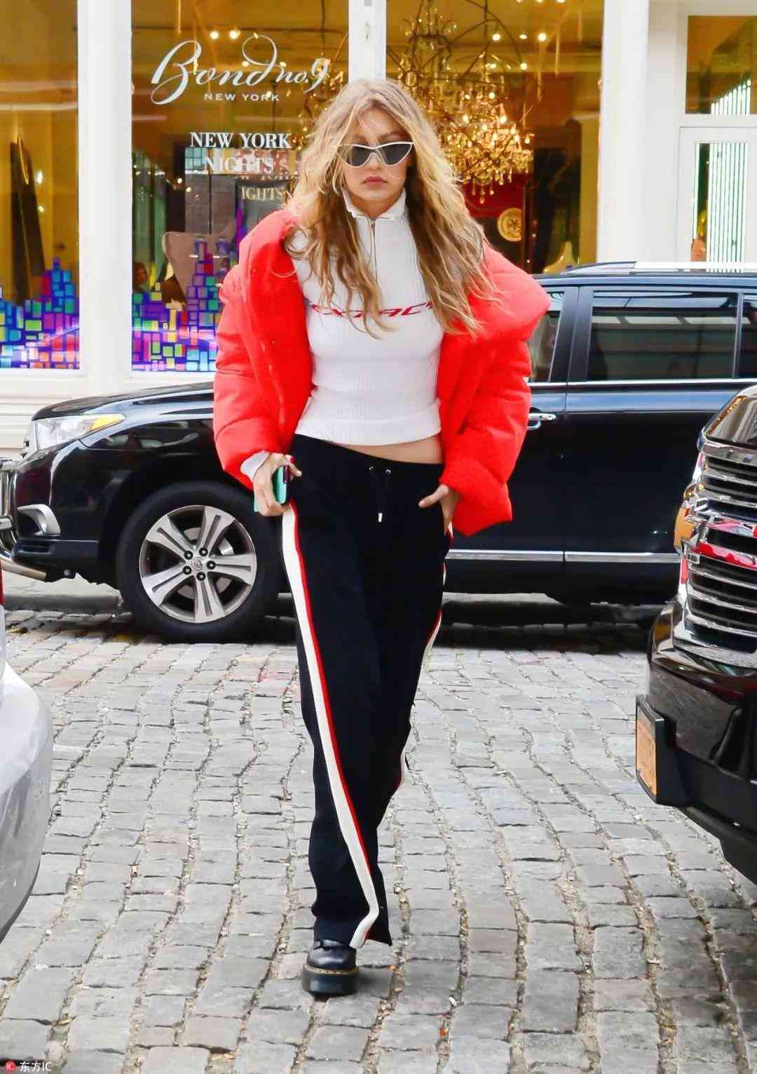 同款運(yùn)動(dòng)衫Gigi Hadid選擇了白色,用豎條紋寬邊闊腿運(yùn)動(dòng)褲搭配馬丁靴,走起路來(lái)都帶風(fēng)。