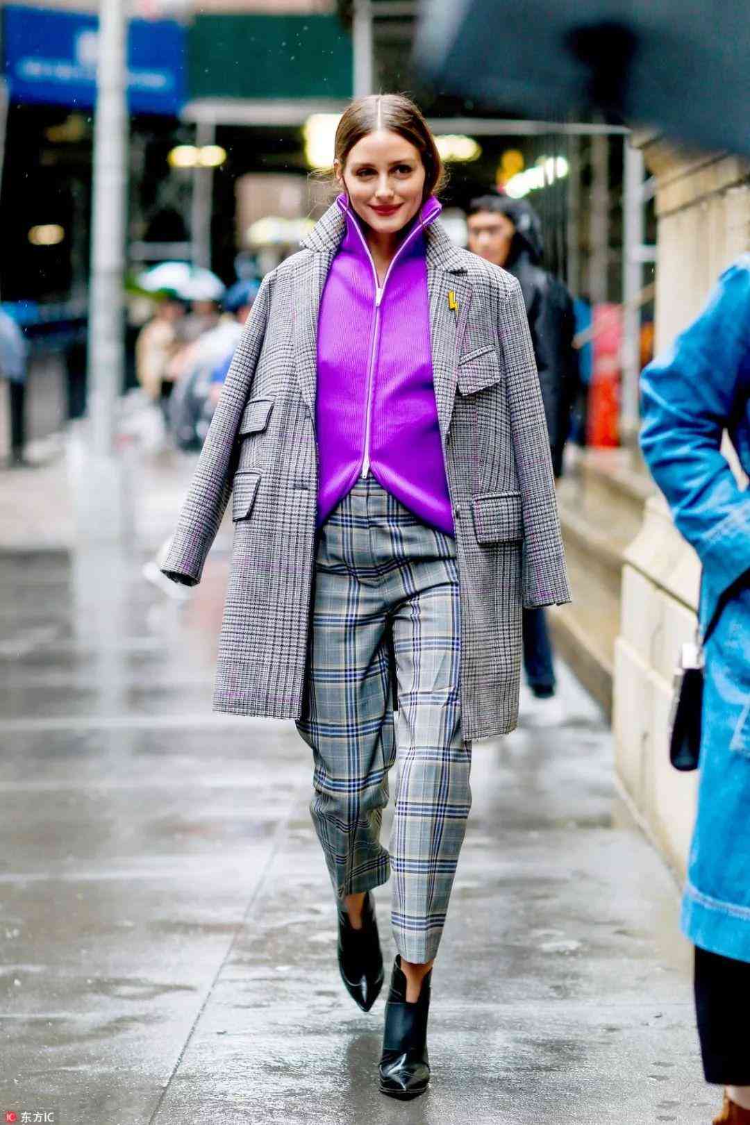 可以像Olivia Palermo一身灰色格紋混搭,再加上紫色高領(lǐng)運(yùn)動(dòng)襯衫。大膽的顏色搭配讓造型立刻活潑起來(lái)。細(xì)節(jié)上小小的閃電胸針點(diǎn)亮全身。