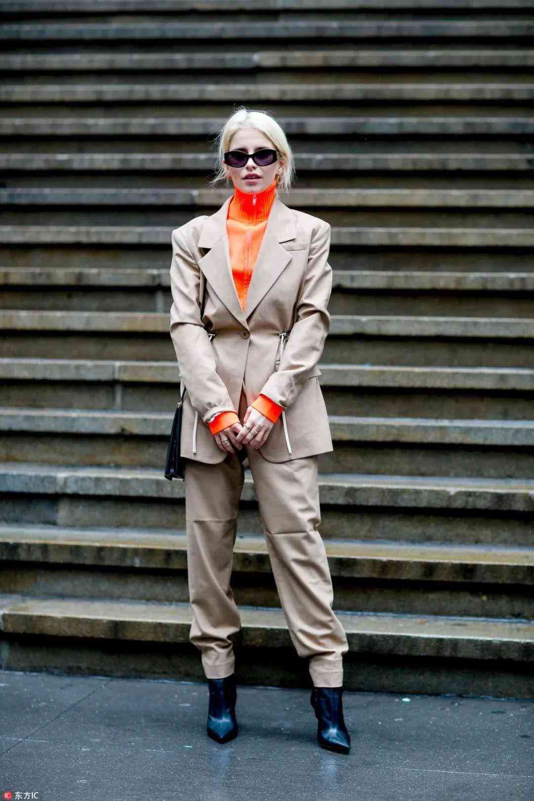 淺一些的大地色系西裝套裝配上黑色尖頭高跟短靴犀利又時(shí)髦。覺(jué)得顏色太素沒(méi)有氣色可以選擇這種亮橘色高領(lǐng)運(yùn)動(dòng)毛衫,提亮膚色不止一點(diǎn)點(diǎn)。