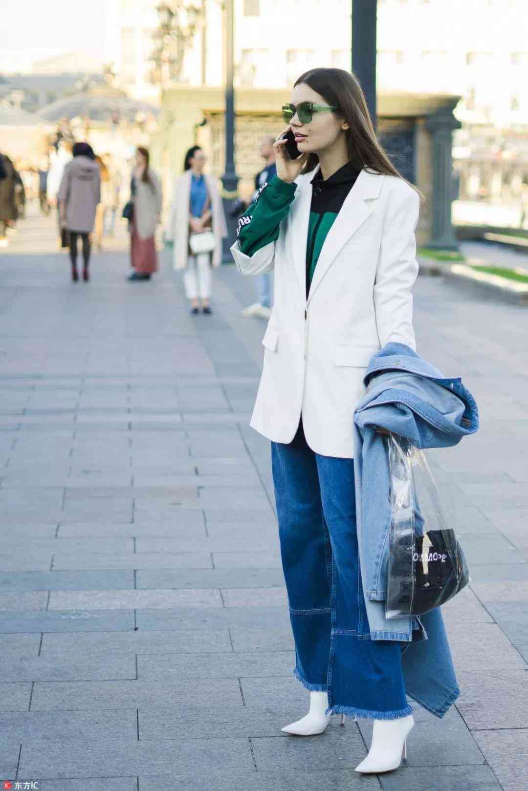 白西裝+小白靴經(jīng)典優(yōu)雅,搭配上一條超寬毛邊牛仔褲增加休閑感,墨綠色運(yùn)動(dòng)衫內(nèi)搭和綠色墨鏡添加顏色的層次感和造型的時(shí)髦度。