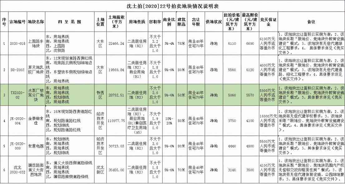 公開資料上顯示,該宗地塊坐落于鐵西區(qū),占地面積28752.51平方米,用地性質(zhì)為二類居住用地(R2),容積率不大于2.0,且大于1.0,商業(yè)比例5%-6%,限高50米,居住年限為住宅70年,商業(yè)40年,起拍價(jià)格為5060元/建筑平方米,最高限價(jià)5570元/建筑平方米。