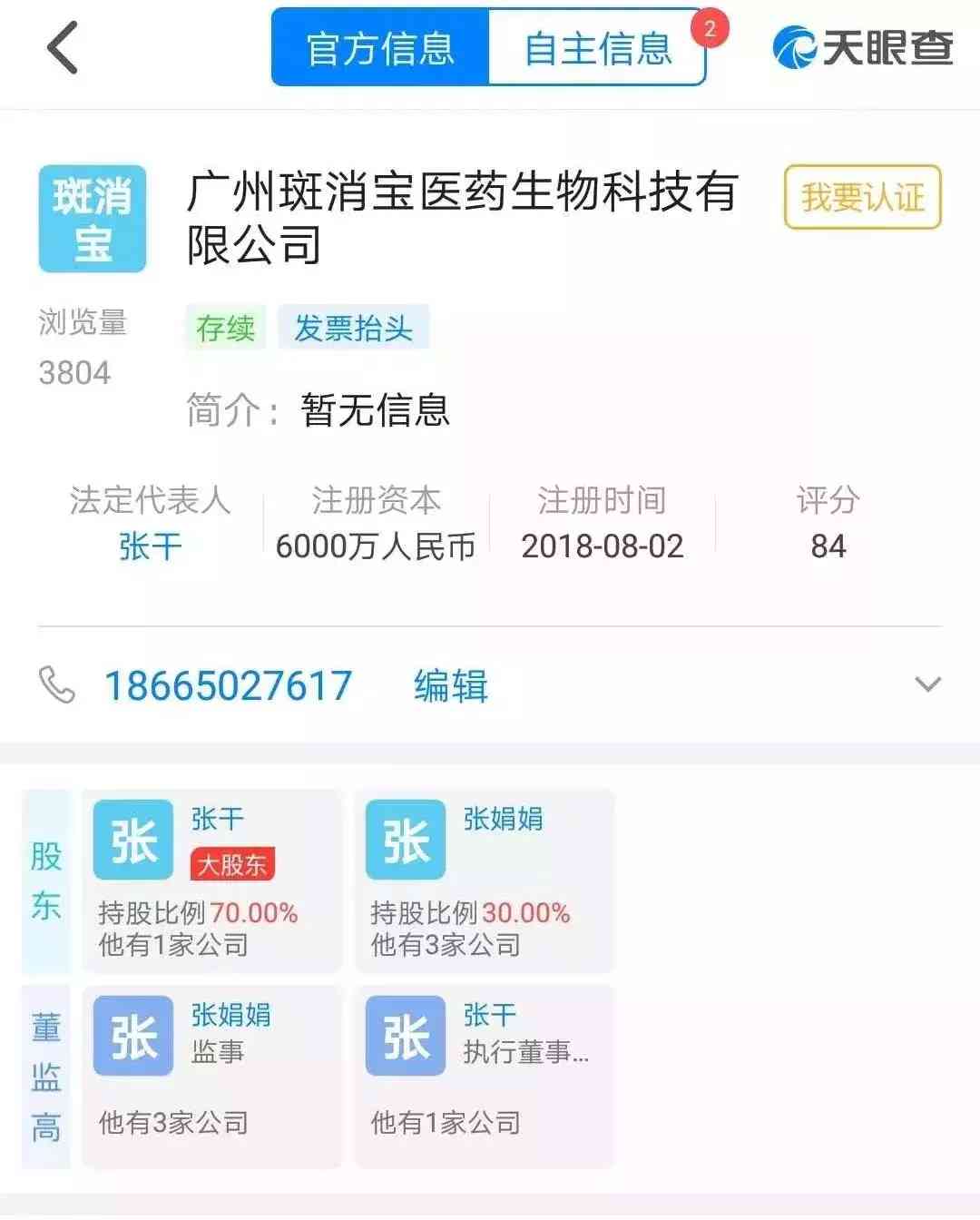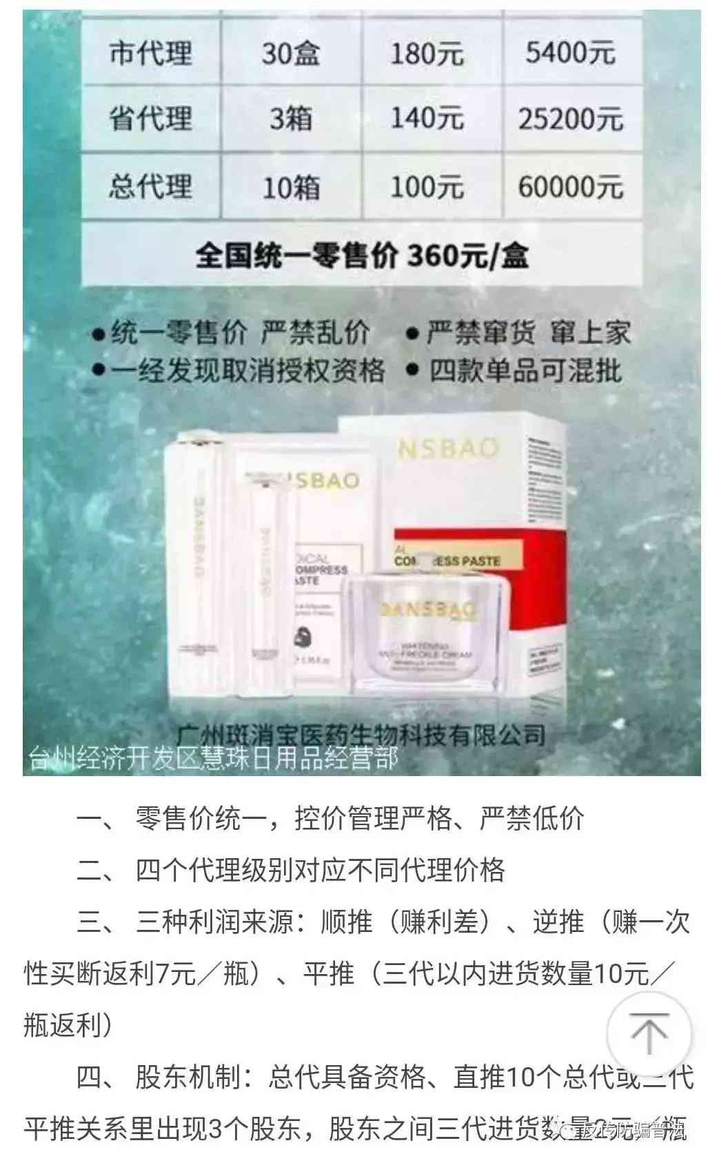 近期有華林酸堿平受害者反饋,他們團隊老大已經(jīng)帶領(lǐng)大家改行了,做了“斑消寶”說不是傳銷,八多百塊錢三盒,還有市代,省代之類。廣州斑消寶醫(yī)藥生物科技有限公司,下文簡稱“斑消寶”。天眼查斑消寶公司成立于2018年8月,法定代表人張干,柳巖為其產(chǎn)品代言。