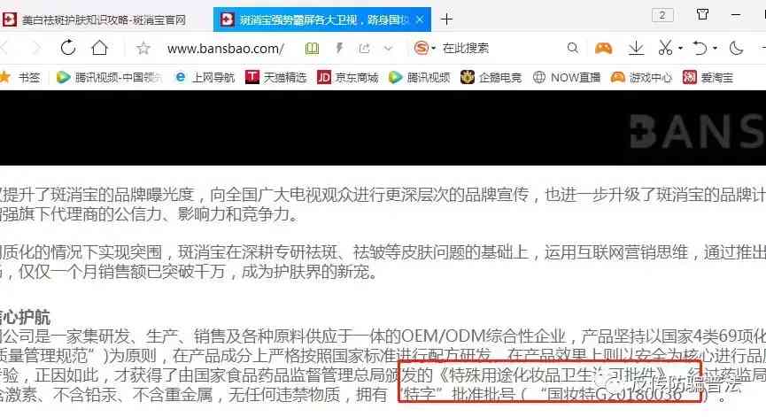 斑消寶官方網(wǎng)站公開資料顯示:為全面開發(fā)亞洲功效型護膚品市場,廣州斑消寶醫(yī)藥生物科技有限公司自此成立,負責亞太地區(qū)功效型護膚品護膚品市場的開發(fā)及銷售業(yè)務。2017年8月份開始研發(fā)美白祛斑產(chǎn)品斑消寶,經(jīng)過長達10個月的研發(fā)測試,2018年5月底正式面世,自此斑消寶品牌計劃全面啟動。斑消寶國特妝字批號是:G20180036