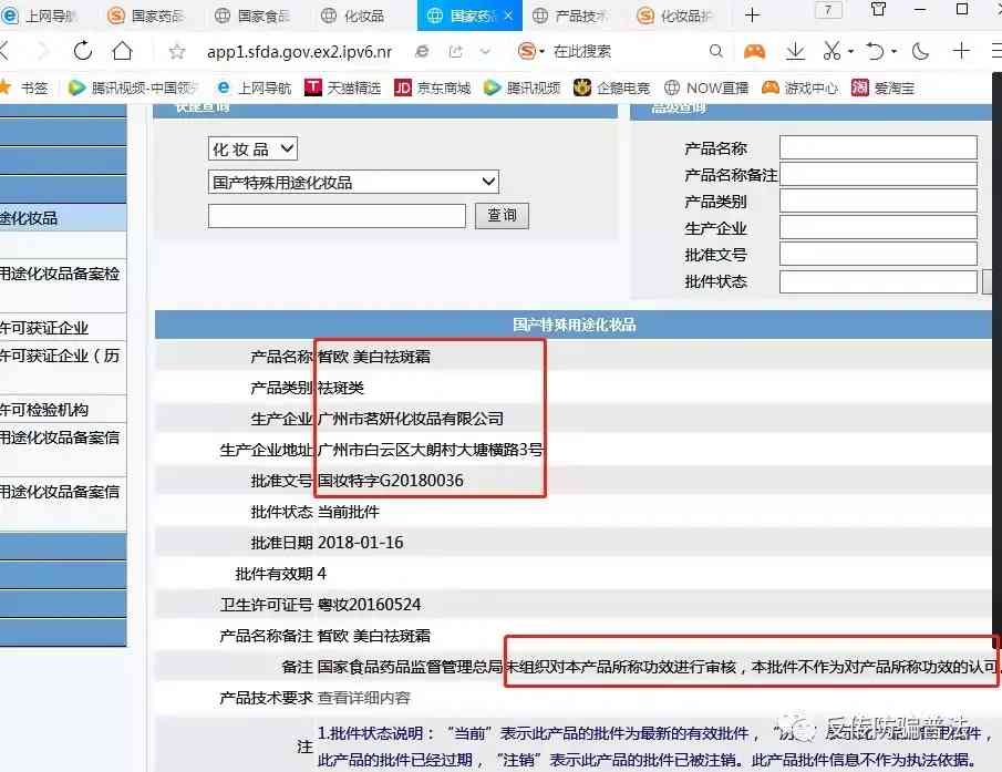 國妝特字G20180036,筆者在國家食品藥品監(jiān)督管理總局查詢結(jié)果是:產(chǎn)品名稱:為皙歐 美白祛斑霜 生產(chǎn)企業(yè)為:茗研化妝品有限公司。備注:國家食品藥品監(jiān)督管理總未組織對本產(chǎn)品所稱功效進行審核,本批件不作為對本產(chǎn)品功效的認可。