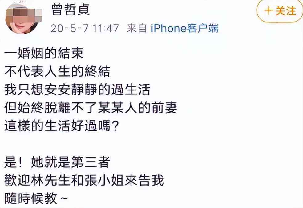 或許是因?yàn)榱秩痍?yáng)和張庭秀恩愛(ài),秀孩子,太過(guò)高調(diào),卻對(duì)前妻的兩個(gè)孩子不聞不問(wèn),據(jù)說(shuō),前妻的兒子連爸爸的微信都沒(méi)有,2020年5月份,曾哲貞發(fā)微博開(kāi)撕,“她就是第三者,歡迎林先生和張小姐來(lái)告我?!?/span>