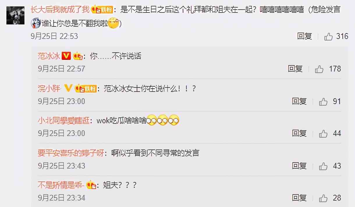 下面有人問生日之后這個(gè)禮拜是不是都和姐夫在一起,范冰冰竟然回復(fù)了一個(gè)“你……不許說話”,粉絲們紛紛留言:“啥情況?”