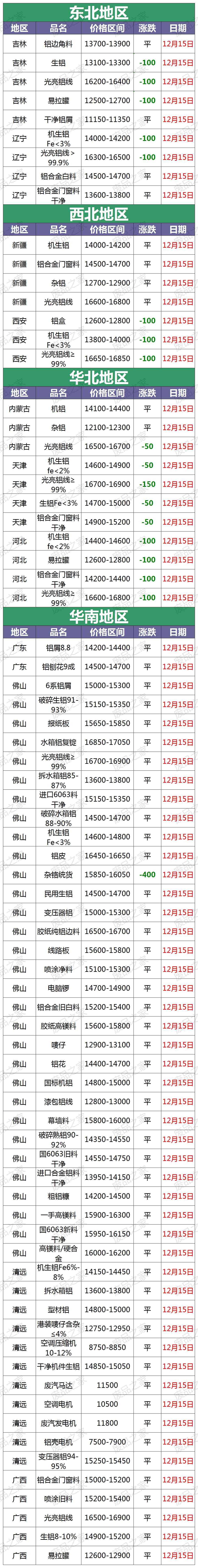 12月15日起,重慶精練鋁業(yè)廢鋁采購價(jià):光亮鋁線16750(帶票),灰線16700(帶票),5052邊角料16700(帶票),6063厚白料16680(帶票),7系厚鋁塊15750(帶票)。