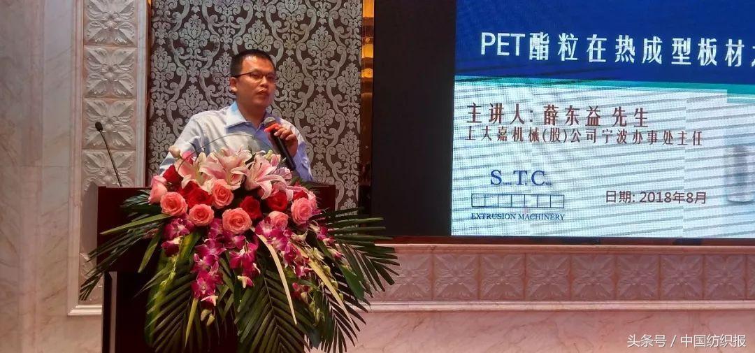 上大嘉機(jī)械(股)公司寧波辦事處主任薛東益講述的是《PET酯粒在熱成型板材之應(yīng)用》。據(jù)介紹,1976年杜邦公司開始將PET用于生產(chǎn)飲料瓶。這種材料具有的特點(diǎn)如下:,優(yōu)良?xì)怏w阻隔性、耐壓性、耐沖擊性、透明性與表面;第二,無毒無味,容易加工且成品美觀,廣泛的應(yīng)用在食品包材容器上;第三,制作過程無須添加增塑劑或添加劑,較環(huán)保且可以回收再制。