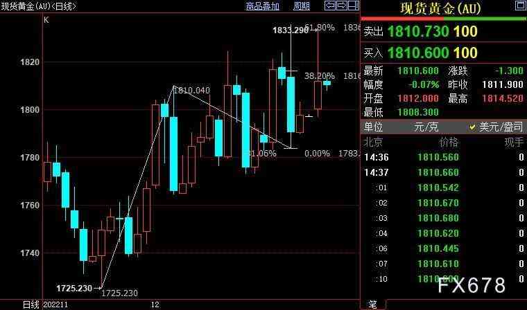 北京時間19:42,現(xiàn)貨黃金下跌0.61%至1802.50美元/盎司;COMEX期金主力合約下跌0.73%至1809.8美元/盎司;美元指數(shù)下跌0.04%至104.155。