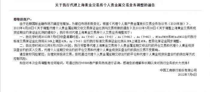 7月4日,工商銀行稱,將對代理上海黃金交易所個人交易業(yè)務(wù)進行調(diào)整。