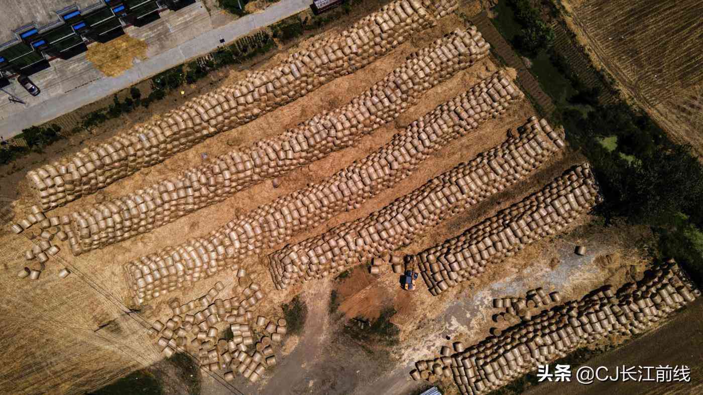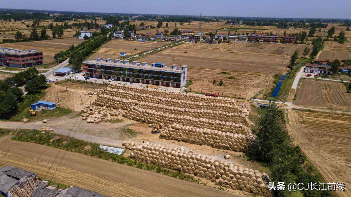 2021年6月6日,河南省淮濱縣西部鄉(xiāng)鎮(zhèn)的麥田里,從空中看去,金黃色的圓圓的小麥秸稈捆散放有序,不遠處的秸稈垛堆積如山,遠遠看去,很是壯觀。