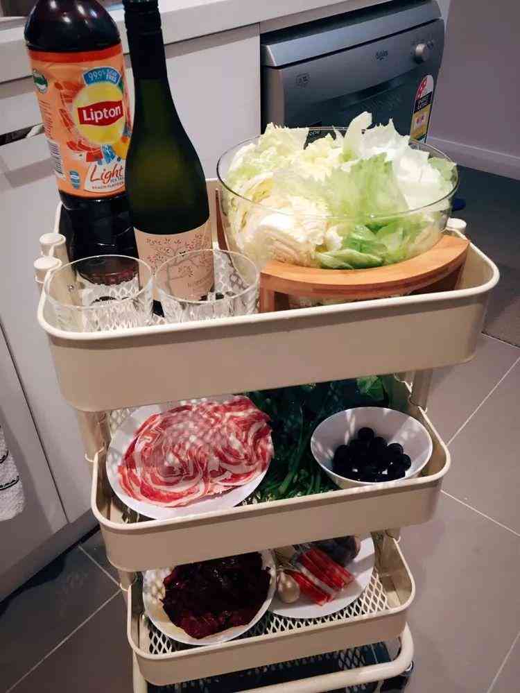 親友聚會(huì)時(shí)餐桌雜物過多,提前把桌面的紙巾、水杯等全清走,放在移動(dòng)的小推車?yán)锩妫妥谰陀懈辔恢脭[放食物,大家用餐時(shí)想用紙巾也不必離開位置,直接移動(dòng)小推車就ok。