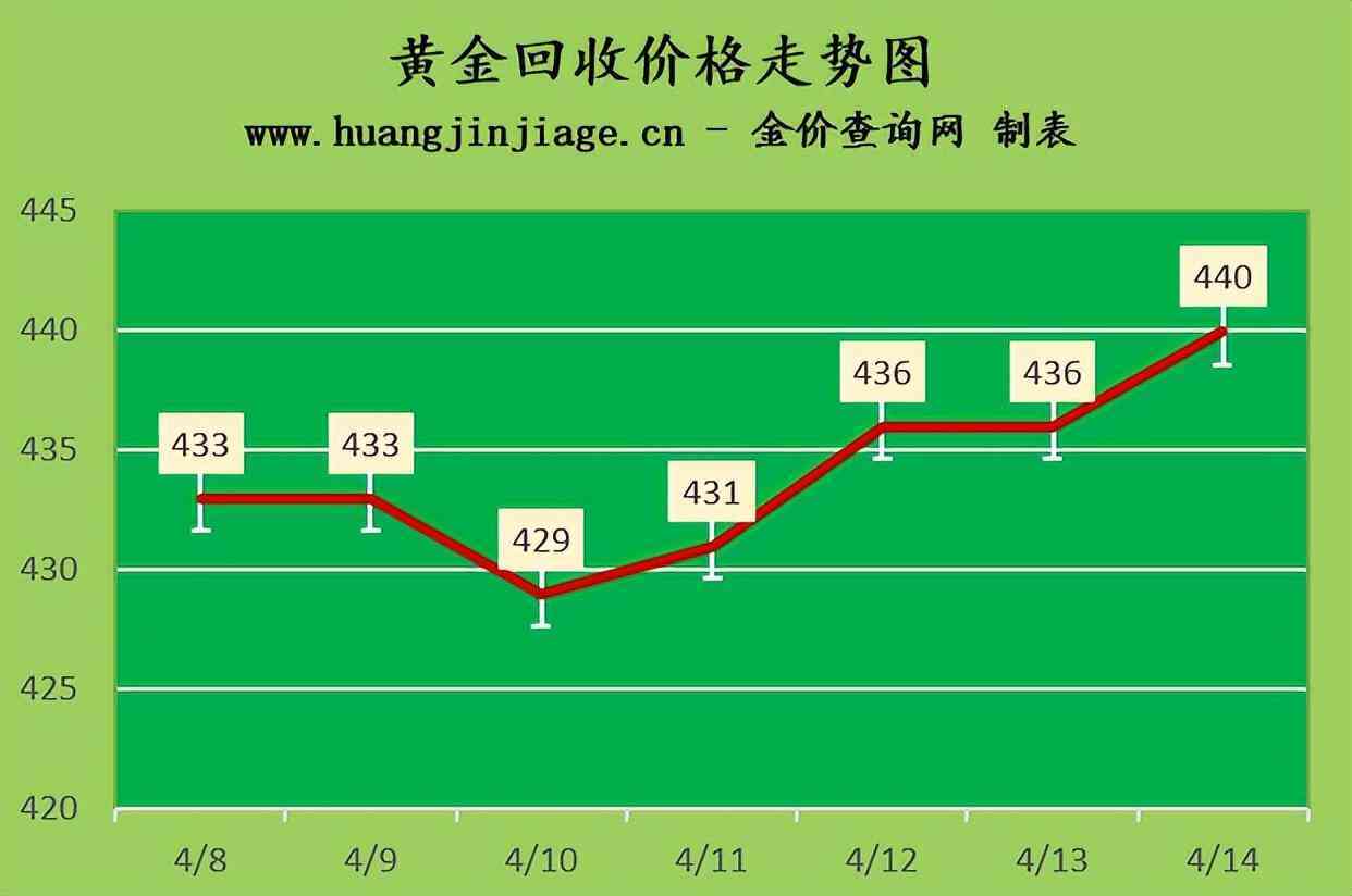黃金回收價格440元/克,鉑金回收價格203元/克,鈀金回收價格308元/克,18K金回收價格315元/克,銀條回收價格4.5元/克。(黃金行情是波動的,回收金價沒有固定標準。)