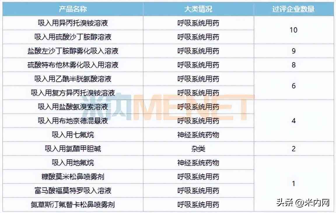 吸入用異丙托溴銨溶液和吸入用硫酸沙丁胺醇溶液過(guò)評(píng)熱度最高,均有10家企業(yè)過(guò)評(píng)。