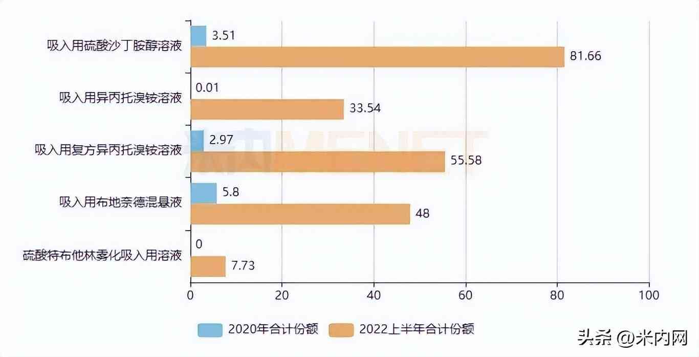 吸入用異丙托溴銨溶液是一種支氣管擴(kuò)張劑,可與吸入性β-受體激動(dòng)劑合用于治療急性或慢性哮喘引起的可逆性氣道阻塞。2021年在中國(guó)城市公立醫(yī)院、縣級(jí)公立醫(yī)院、城市社區(qū)中心及鄉(xiāng)鎮(zhèn)衛(wèi)生院(簡(jiǎn)稱中國(guó)公立醫(yī)療機(jī)構(gòu))終端,吸入用異丙托溴銨溶液的銷售額超過(guò)8億元,2022上半年該產(chǎn)品在呼吸系統(tǒng)用藥吸入產(chǎn)品排名TOP11。