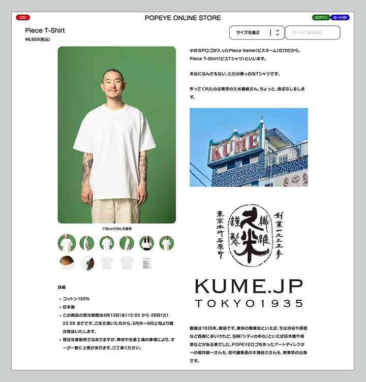 而且,不同于其他賣 logo T 恤卻忽視品質(zhì)的店家,POPEYE 在品質(zhì)上也不敢砸了自家招牌,面料選用了 1935 年就創(chuàng)立的久米紡織工業(yè)(KUME.JP)的高品質(zhì)產(chǎn)品,久米紡織也一直被譽(yù)為「日本最擅長(zhǎng)做 T 恤」的公司。