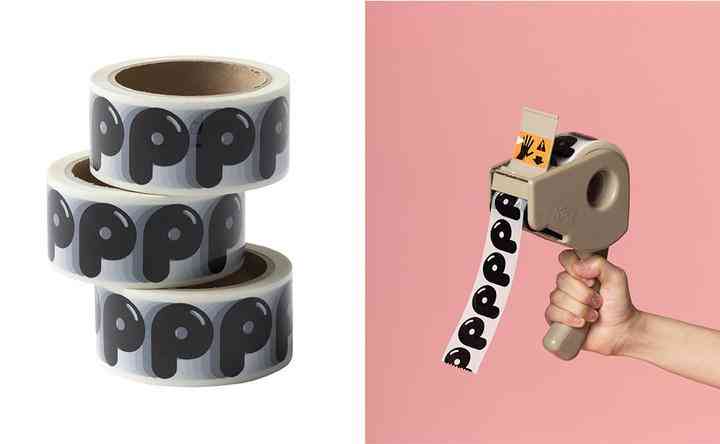 最后一件產(chǎn)品,印有 P 字母的膠帶,將會(huì)用在每個(gè)包裹的包裝上,同時(shí)也上架一同銷售。這也多虧了崛內(nèi)誠(chéng)一的設(shè)計(jì),如果用了普通字體庫的常見字體,再做出這么一卷膠帶,想必也很難讓人埋單。