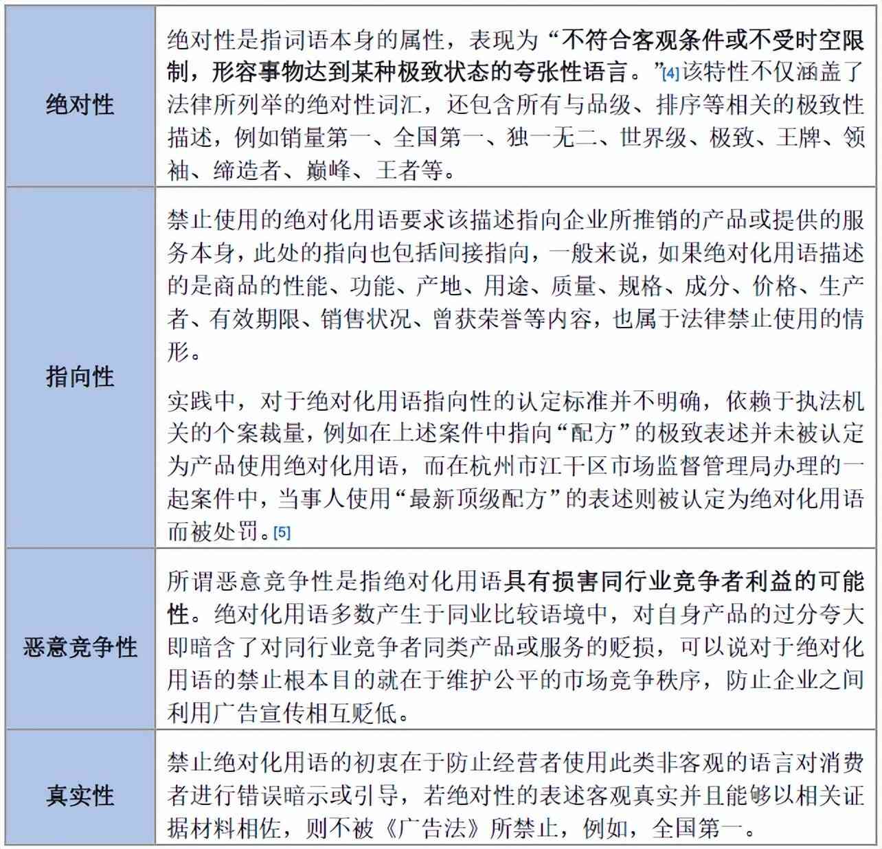 由于法律條文的簡潔性以及中文詞語語義的多樣性和復雜性,造成實踐當中對于絕對化用語的判定難以把握,是否構(gòu)成絕對化用語應當以《廣告法》對廣告內(nèi)容的原則性規(guī)定為基本依據(jù),結(jié)合廣告詞語的詞性、指向性、真實性等特性進行綜合考量: