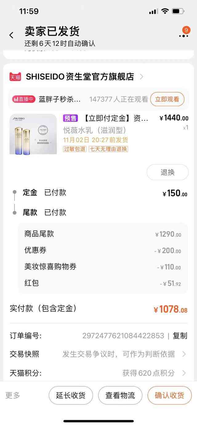 馮女士當(dāng)時(shí)付了150元定金。她說,10月31日,按照直播間購買規(guī)則,需付尾款,李佳琦直播間顯示商品尾款為1290元,加上產(chǎn)品優(yōu)惠券和美妝驚喜購物券及紅包,最后馮女士實(shí)際付款總計(jì)1078元。