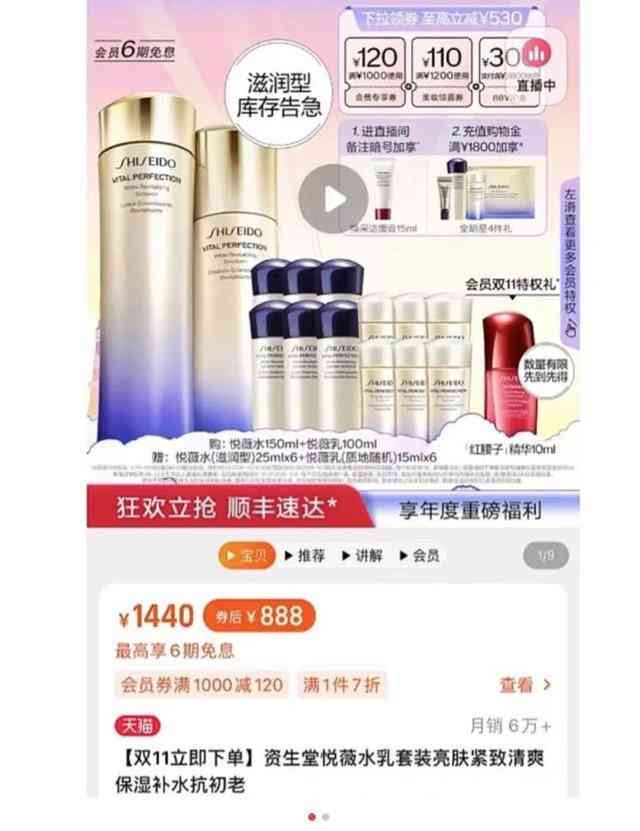 11月4日,來自上海的馮女士向澎湃質(zhì)量報(bào)告投訴平臺反映,10月24日,她通過雙11李佳琦直播間,在資生堂官方旗艦店購買一套“【雙11預(yù)售】資生堂悅薇水乳套裝亮膚緊致清爽保濕補(bǔ)水套裝”。當(dāng)天,直播間商品原價(jià)顯示為1440元,李佳琦直播間到手價(jià)為1240元。