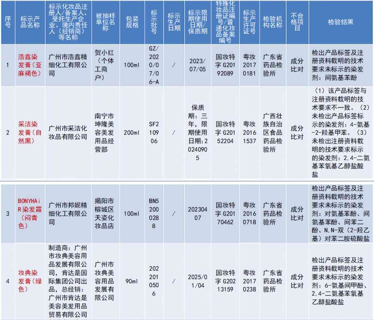 廣州市妝典美容用品發(fā)展有限公司制造的妝典染發(fā)膏(綠色)、妝典染發(fā)膏(青綠色),成分比對(duì)不合格;